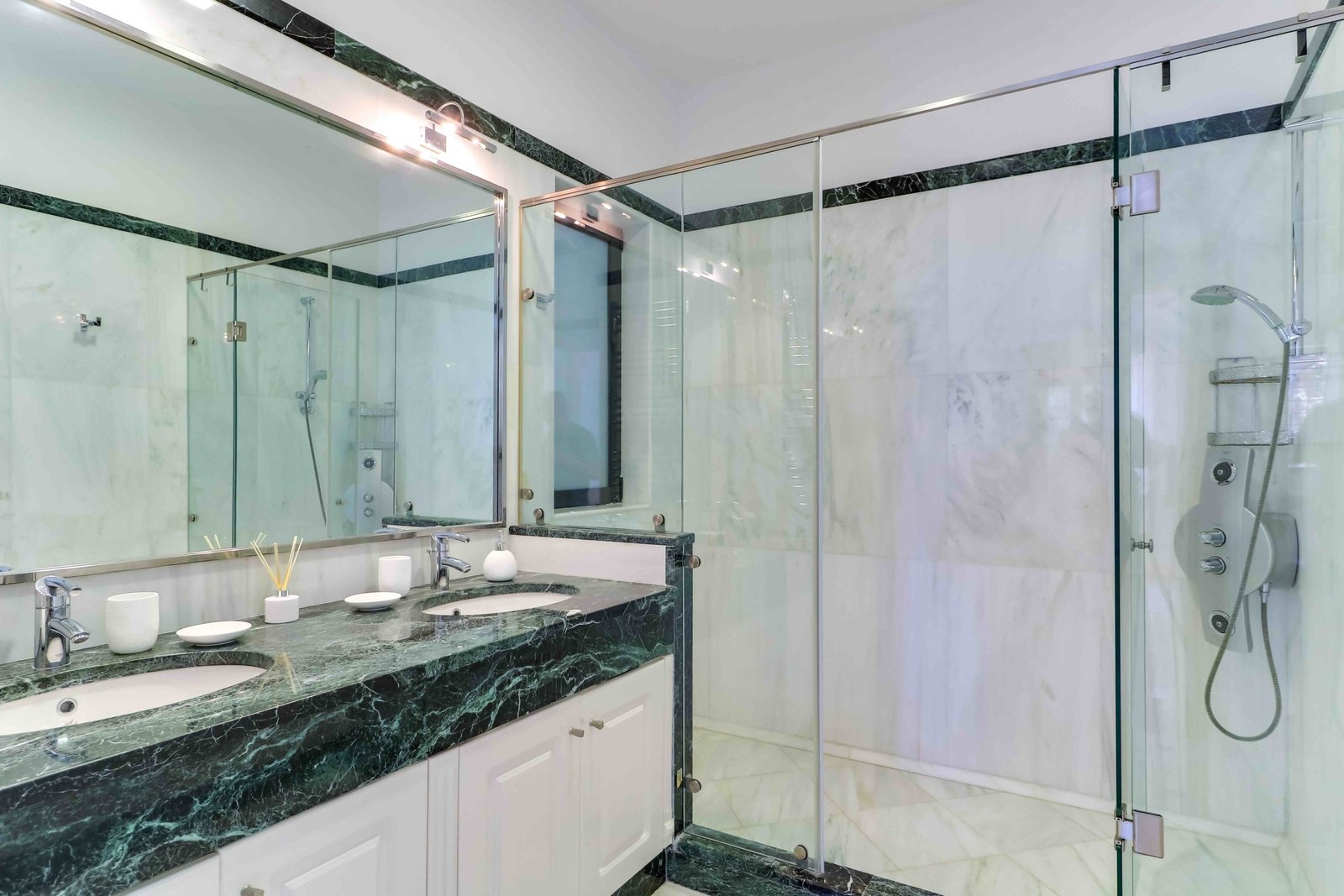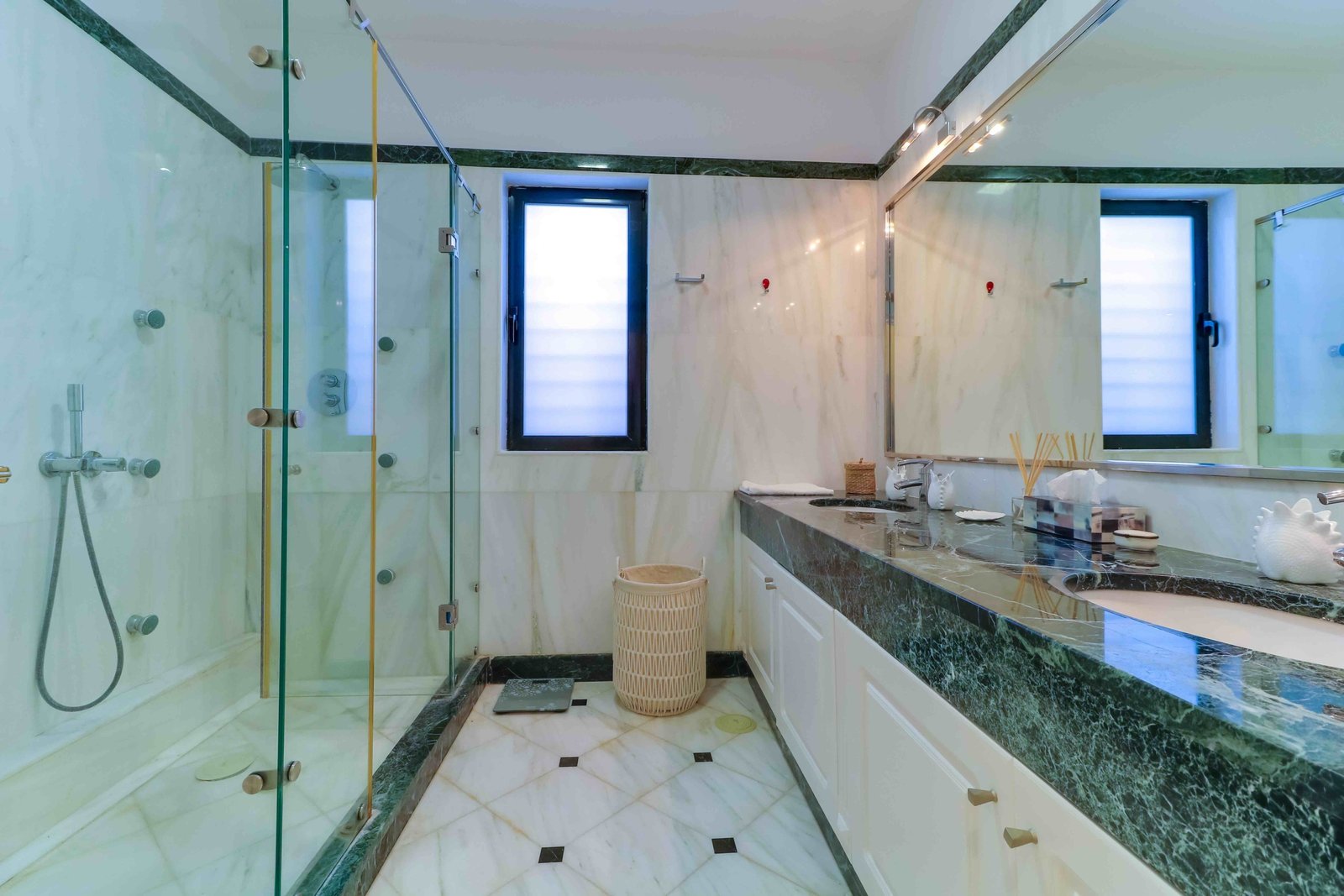 The villa has 6 ensuite master bedrooms, 2 living rooms, a playroom, 2 dining rooms, a 360 view pool with a sea view, a kitchen, and another professional kitchen with a private chef and staff room.